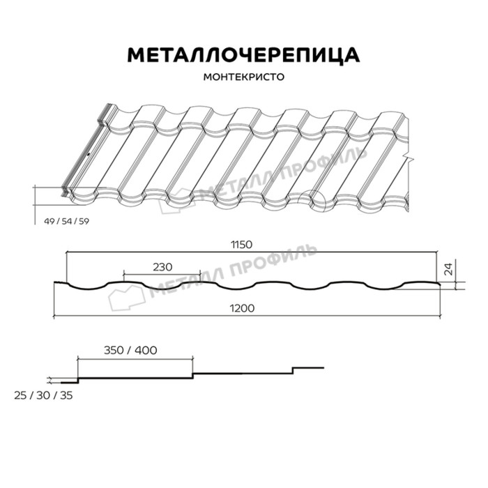 Новый профиль выгодно отличается от традиционной линейки металлочерепицы. Это и невидимые примыкания, полученные благодаря фигурной обрезке нижней кромки, и модифицированная конструкция бокового замка, защищающая от протечек. Профиль МОНТЕКРИСТО — это совокупность прямых линий и округлых черт, которые гармонично будут сочетаться практически с любым дизайнерским решением — от модерна до минимализма. Мы предлагаем потребителю возможность подобрать наиболее подходящий вариант кровли. Выбрать можно как высоту ступеньки (25/30/35 мм), так и её длину (350/400 мм). Большой выбор сочетаний призван удовлетворить индивидуальные запросы заказчика.