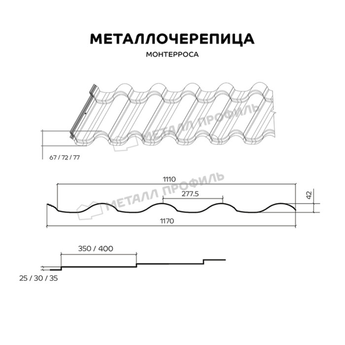 В 2018 году компания «Металл Профиль» вывела на рынок новинку. Высота этого профиля достигает 77 мм. В сочетании с нижней кромкой, обрезанной по форме волны, он напоминает натуральную керамическую черепицу, весьма популярную в Европе. Комбинируя различные ступеньки, вы сможете подобрать для себя оптимальный вариант, идеально подходящий вашему дому. Заметим: на крупных скатах кровли лучше будут смотреться максимальные размеры профиля Монтерроса®. Чтобы обеспечить водонепроницаемость металлочерепицы, мы модернизировали вид бокового замка. Его незначительная ширина увеличивает рабочую площадь листа. Металлочерепица Монтерроса® изготовлена из качественного сырья, что гарантирует высокое качество изделия.
