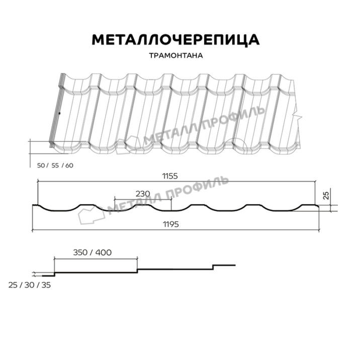 ТРАМОНТАНА — премьера на рынке металлочерепицы. За счёт многочисленных рёбер жёсткости материал крайне устойчив к порывам ветра и пригоден для строительства даже в самых тяжёлых климатических условиях. Значительная высота профиля (50/55/60 мм на выбор) в сочетании со срезанным гребнем волны придают металлочерепице ТРАМОНТАНА неповторимое обаяние. Кроме прочих достоинств новой черепицы, стоит отметить её 100% водонепроницаемость. Она достигается за счёт улучшенной конструкции бокового замка — две капиллярные канавки не дают осадкам проникнуть под крышу. Эту же задачу решает и отличная стыковка листов, прошедших строгий многоступенчатый контроль. Горизонтальные соединения черепицы с профилем ТРАМОНТАНА незаметны на готовой кровле за счёт обрезки нижней кромки по форме волны. Новый профиль выпускается в покрытиях сегментов Премьер и Премиум в линейке Компании Металл Профиль. Покрытия имеют обширную цветовую палитру, включая оттенки «металлик», а также впечатляющие технические характеристики, которые обеспечат вам крепкую кровлю на несколько десятилетий*.
